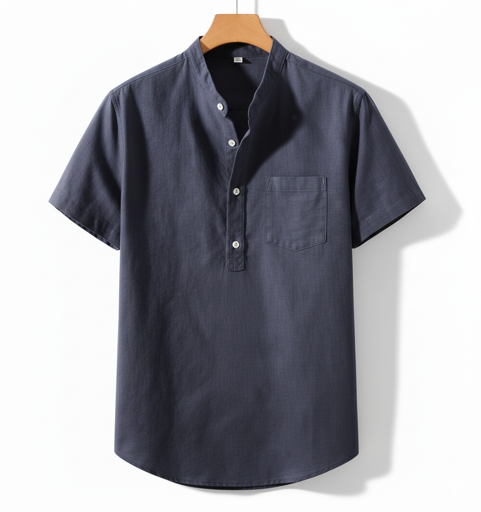 Diseño: Camisa de manga corta con sofisticado cuello mao, pechera de tres botones y un práctico bolsillo frontal.