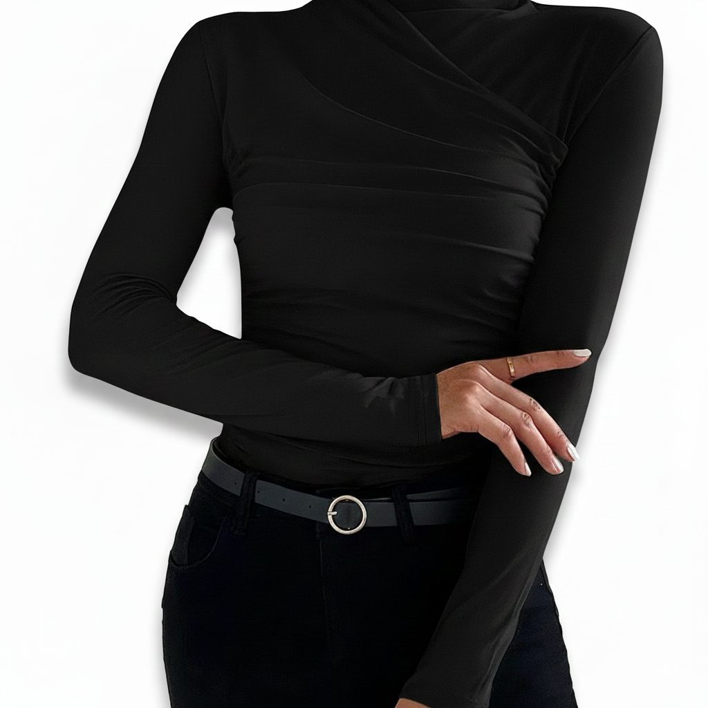 Diseño: Cuello alto con sofisticado drapeado cruzado en el pecho y detalle de fruncido lateral que estiliza la figura.